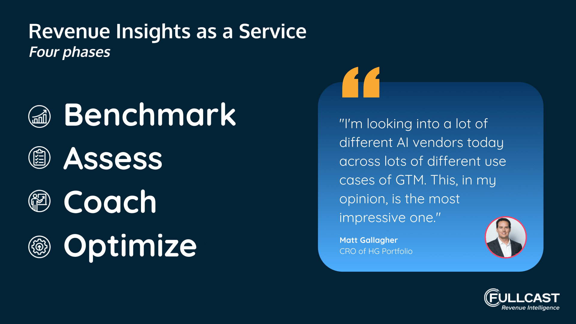 Fullcast Revenue Intelligence exposes deal risk early, scores engagement, and reveals the patterns behind wins and losses. Improve forecast accuracy, reduce slippage, and confidently call your number.